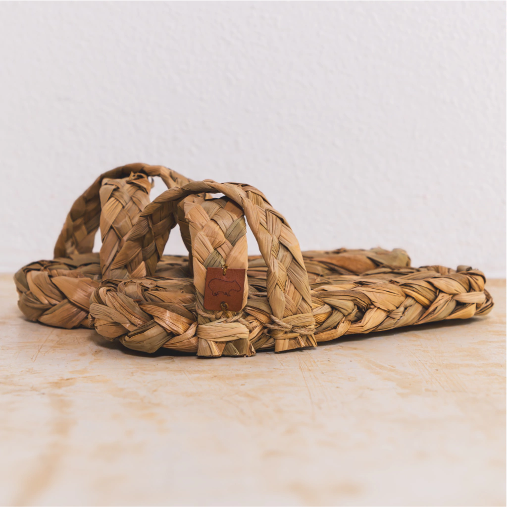 A Sandália de Taboa Trançada é uma peça artesanal confeccionada com fibras naturais da taboa, cuidadosamente entrelaçadas para formar um calçado leve, confortável e cheio de personalidade. Cada par carrega o toque das mãos que o criaram — e a beleza simples das coisas feitas com tempo e afeto.